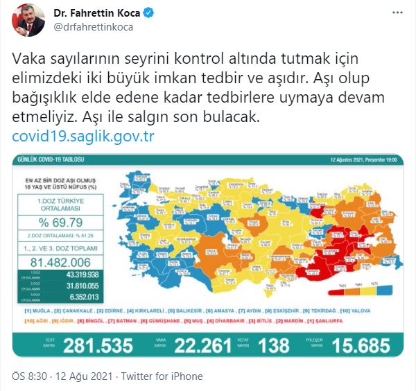 Sağlık Bakanı Fahrettin Koca resmi Twitter hesabından 12 Ağustos 2021 koronavirüs tablosunu açıkladı.
