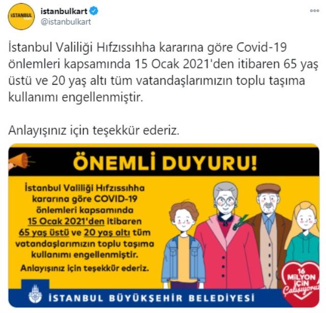 "İstanbul Valiliği Hıfzıssıhha kararına göre Covid-19 önlemleri kapsamında 15 Ocak 2021'den itibaren 65 yaş üstü ve 20 yaş altı tüm vatandaşlarımızın toplu taşıma kullanımı engellenmiştir."