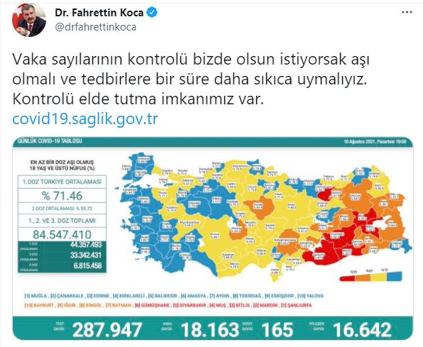 Sağlık Bakanı Fahrettin Koca resmi Twitter hesabından 16 Ağustos 2021 koronavirüs tablosunu açıkladı.