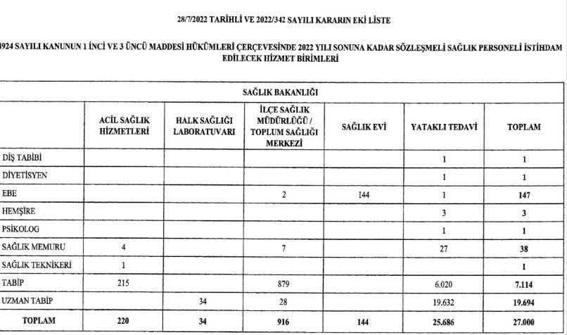 Karara göre; 2022 yıl sonuna kadar 19 bin 694 uzman doktor, 7 bin 114 doktor, 147 ebe, 38 sağlık memuru, 3 hemşire, 1 diyetisyen, 1 diş doktoru, 1 psikolog ve 1 sağlık teknikeri sözleşmeli olarak istihdam edilecek.