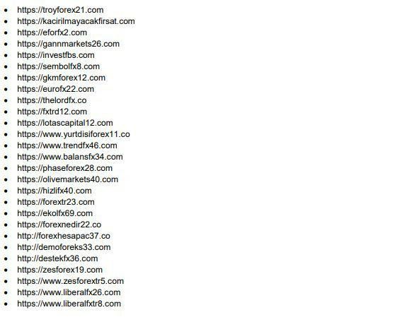 Türkiye’de yerleşik kişilere yönelik olarak internet aracılığıyla yurtdışında kaldıraçlı işlem yaptırıldığı belirlenen ve aşağıda adresleri verilen internet sitelerine erişimin engellenmesi için Sermaye Piyasası Kanunu’nun 99’uncu maddesinin dördüncü fıkrası uyarınca gerekli hukuki işlemlerin yapılmasına karar verildiği belirtildi.