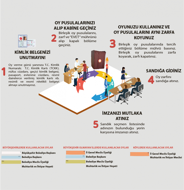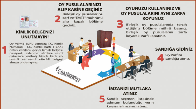 Oy verme günü yanınıza Türkiye Cumhuriyeti kimlik numarasını taşıyan; Türkiye Cumhuriyeti Kimlik Kartı, Geçici Kimlik Belgesi, nüfus cüzdanı, resmî dairelerce verilen soğuk damgalı kimlik kartı, pasaport, evlenme cüzdanı, askerlik belgesi, sürücü belgesi, hâkim ve savcılar ile yüksek yargı organı mensuplarına verilen mesleki kimlik kartı, avukat, noter ve askerî kimlik kartı gibi kimliğini tereddütsüz ortaya koyan resimli, resmî nitelikteki belgelerden birini yanınızda bulundurmayı unutmayınız.