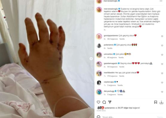 Instagram hesabından birçok yerine dikiş atılan ve moraran elini paylaşan 32 yaşındaki Merve Veziroğlu, şu ifadeleri kullandı: