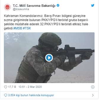 MSB’nin Twitter hesabından yapılan açıklamada, komandoların, Barış Pınarı bölgesi güneyine sızma girişiminde bulunan terörist gruba başarılı şekilde müdahale ederek, 32 PKK/YPG’liyi etkisiz hale getirdiği belirtildi.