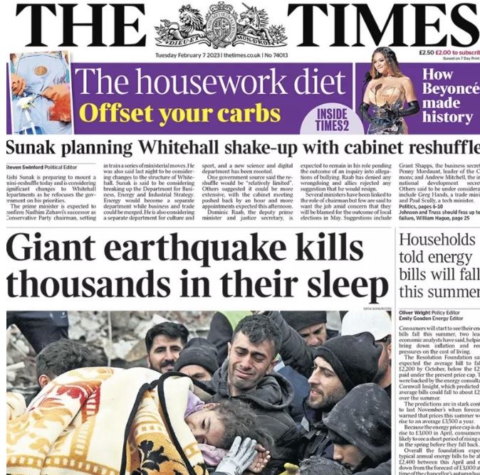 Birinci sayfasında Diyarbakır'dan aynı fotoğrafı kullanan Times'ın manşetinde de "Dev deprem, binlerce kişiyi uykusunda öldürdü" deniliyor. Gazete Türkiye ve Suriye'deki ölü sayısının artmasının beklendiğini söylerken, dünya genelinden yardım önerilerinin yağdığını duyurdu.