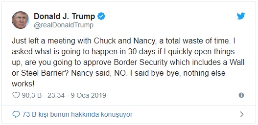 "Chuck ve Nancy ile toplantımızı terk ettim, tamamıyla zaman kaybı. (Hükümeti) 30 gün içerisinde açarsam Duvarı ve Çelik Bariyerleri de içeren Sınır Güvenliği'ni kabul edecek misiniz diye sordum. Nancy 'Hayır' dedi, ben de 'Bye bye' dedim, başka hiçbir şey işe yaramaz!" ifadelerini kullandı.
