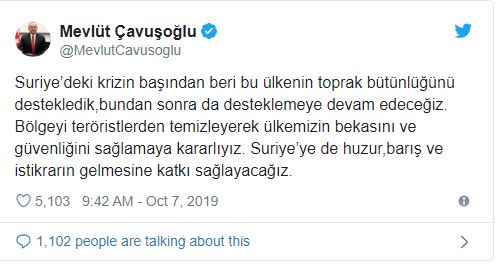 Bakan Çavuşoğlu, "Suriye’deki krizin başından beri bu ülkenin toprak bütünlüğünü destekledik, bundan sonra da desteklemeye devam edeceğiz. Bölgeyi teröristlerden temizleyerek ülkemizin bekasını ve güvenliğini sağlamaya kararlıyız. Suriye’ye de huzur, barış ve istikrarın gelmesine katkı sağlayacağız." ifadesini kullandı.