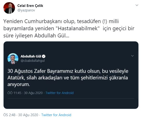 Gül'ün paylaştığı "30 Ağustos Zafer Bayramımız kutlu olsun, bu vesileyle Atatürk, silah arkadaşları ve tüm şehitlerimizi şükranla anıyorum." Twetter mesajını alıntılayarak cevap veren Celal Eren Çelik'in tweeti sosyal medyada binlerce yorum ve beğeni aldı.
