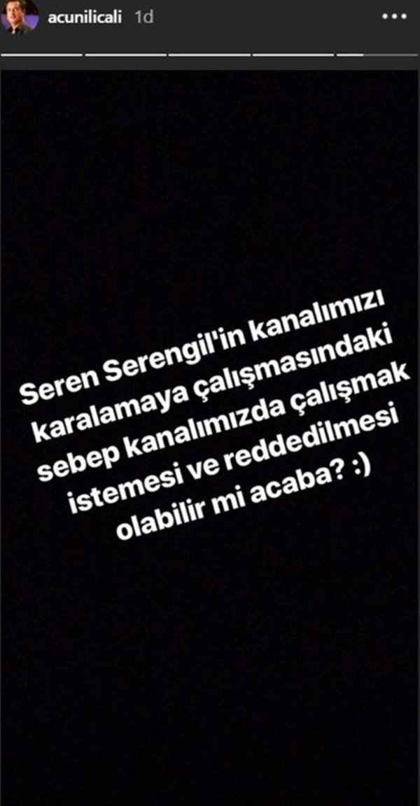 Acun Ilıcalı, ''Seren Serengil'in kanalımızı karalamaya çalışmasındaki sebep kanalımızda çalışmak istemesi ve reddedilmesi olabilir mi acaba? :)'' paylaşımında bulundu.