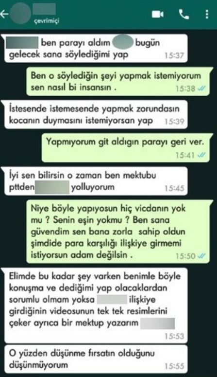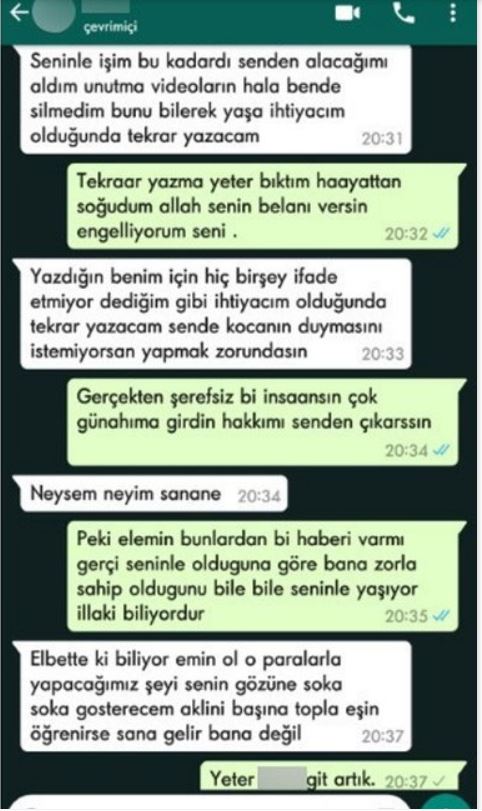 B.A.Ç.'nin dediklerini mecburiyetten yaptığını söyleyen G.Y., "Annemin arkadaşı bu adam. Annemin evinde kalmam gerekiyordu. Sokakta kalamam sonuçta 1 çocuğum var. Gelip gidiyorlardı sürekli böyle bir şey olacağını hiç düşünmedim. Eşi beni eve çağırdı gittim. Sabah uyandığında bir şey hatırlamıyorum. 2 gün sonra bana mesaj attı ve tehdit etti. Yanına gidip fotoğraf ve videoları gördüm. 'Ne hakla bunu yapabilirsin' dediğimde bana 'Eğer dediklerimi yapmazsan eşine, cezaevine bu fotoğraf ve videoları gönderirim' dedi. Eşime ilk zamanlar söylemedim mecbur kaldım dediklerini yapmaya" diye konuştu.