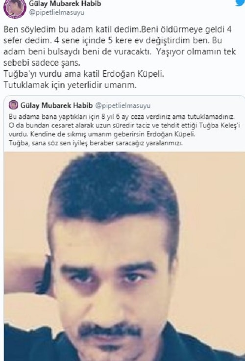 Mübarek, sosyal medyada yaptığı paylaşımlarla Erdoğan Küpeli'nin kendisine yaşattıklarını paylaşmış, ancak adalet karşısında hatırı sayılır bir sonuç alamadığından yakınmıştı.