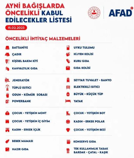 Kahramanmaraş merkezli iki büyük deprem ardından Türkiye genelinde yardım kampanyaları başlatıldı. AFAD bağışlarda öncelikli kabul edilen ihtiyaçların güncel listesini paylaştı.