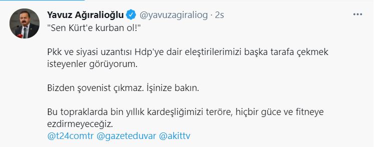 "Sen Kürt'e kurban ol!" Pkk ve siyasi uzantısı Hdp'ye dair eleştirilerimizi başka tarafa çekmek isteyenler görüyorum. Bizden şovenist çıkmaz. İşinize bakın. Bu topraklarda bin yıllık kardeşliğimizi teröre, hiçbir güce ve fitneye ezdirmeyeceğiz.