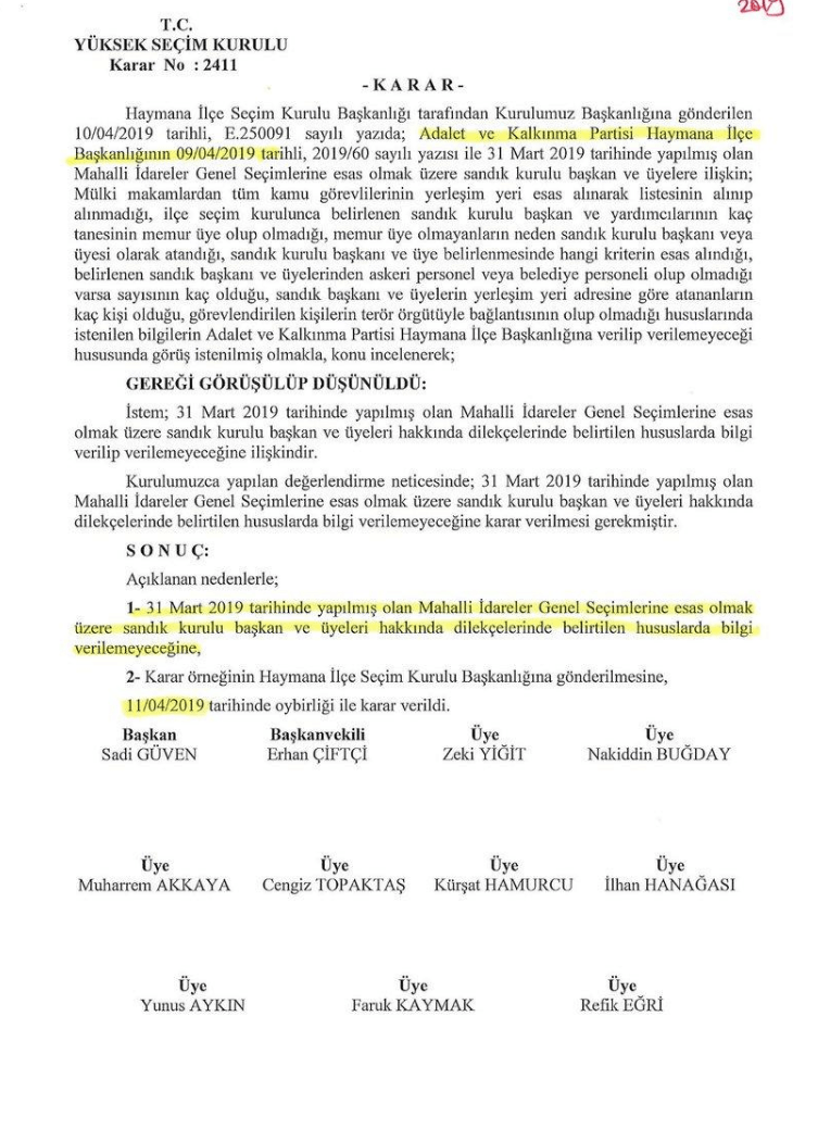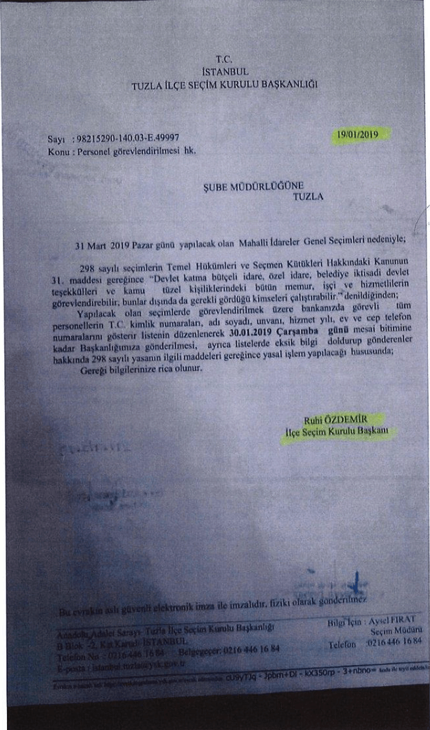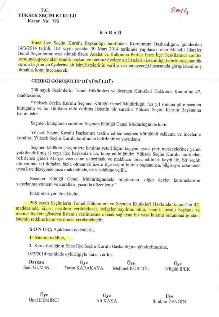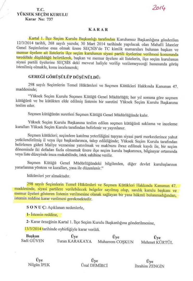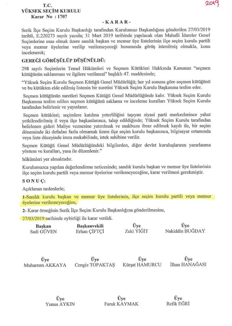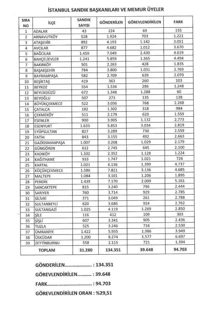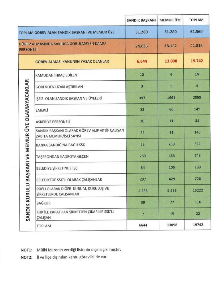 Mülki İdare, 298 sayılı yasanın 22. ve 23.maddeleri gereği,134.351 kişilik kamu görevlileri listesini seçim kurullarına vermiş ancak seçim kurulları 62.560 kişinin tamamını bu listelerden ataması gerekirken 19.742 kişiyi kanuna aykırı şekilde bu listelerin dışından belirlemiş.