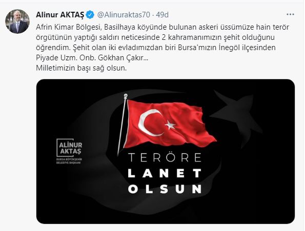 Bursa Büyükşehir'in AK Partili Belediye Başkanı Alinur Aktaş, Milli Savunma Bakanlığı'nın duyurduğu "Afrin'de iki şehidimiz var" haberini bakanlıktan önce paylaştı.