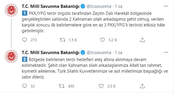 "Afrin temas hattı üzerindeki Kimar Bölgesi, Basilhaya köyünde bulunan askeri üssümüze hain terör örgütünün yaptığı saldırı neticesinde 2 kahramanımızın şehit olduğunu öğrendim. Şehit olan iki evladımızdan biri Bursa’mızdan... Milletimizin başı sağ olsun."