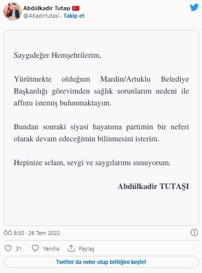 "Mardin'in Artuklu ilçesinde Saygıdeğer hemşerilerim, yürütmekte olduğum Mardin/Artuklu Belediye Başkanlığı görevimden sağlık sorunlarım nedeni ile affımı istemiş bulunmaktayım. Bundan sonraki hayatıma partimin bir neferi olarak devam edeceğimin bilinmesini isterim. Hepinize selam, sevgi ve saygılarımı sunuyorum."