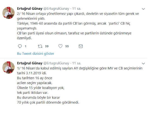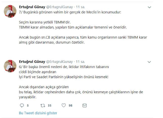 AKP’li eski Bakan Ertuğrul Günay, sosyal medyada paylaştığı açıklamasında “16 Nisan’da kabul edilmiş sayılan AY değişikliğine göre MV ve CB seçimlerinin tarihi 3.11.2019 idi. Bu tarihten 16 ay önce acilen seçim yapılacak. Ülkede 15 yıldır koalisyon yok, tek parti iktidarı var. Bu durumda böyle bir karar 70 yıllık çok partili dönemde görülmedi” ifadelerini kullandı.