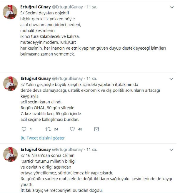 Ertuğrul Günay, değerlendirmelerini şöyle sürdürdü: “Yakın geçmişte büyük karşıtlık içindeki yapıların ittifakının da derde deva olamayacağı, üstelik ekonomik ve dış politik sorunların artacağı kaygısıyla acil seçim kararı alındı. Bugün OHAL, 90 gün süreyle 7. kez uzatılırken, 65 gün içinde acil seçime kalkışılması bundan.