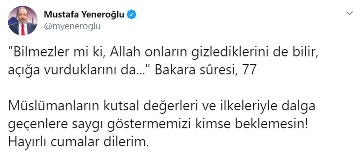 Egemen Bağış’ın 17-25 Aralık sürecinde gündeme gelen "Her Cuma bir ayet sallıyorum, bakara makara" şeklindeki internete düşen bir ses kaydını hatırlatan AKP Milletvekili Mustafa Yeneroğlu Twitter’da şunları yazdı: