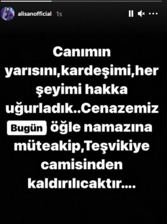 Haftalardır kardeşinden gelecek iyi haberi bekleyen ve bir an olsun hastane önünden ayrılmayan Alişan ise aldığı ölüm haberiyle yıkıldı. Sabaha karşı sosyal medya hesabından acı haberi duyuran Alişan, "Canımın yarısını, kardeşimi, her şeyimi hakka uğurladık. Cenazemiz bugün öğle namazına müteakip Teşvikiye camisinden kaldırılacaktır" dedi.