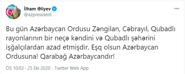 Azerbaycan Cumhurbaşkanı İlham Aliyev, twitter hesabından yaptığı paylaşımda beklenen müjdeli haberi verdi. Aliyev, Zengilan, Cebrayi ve Gubatlı'nın bir kaç köyü ile Gubatlı şehrinin işgalden kurtarıldığını açıkladı.