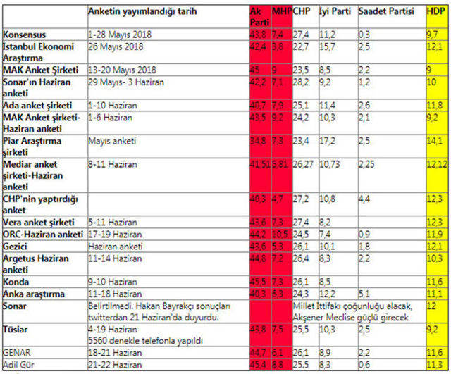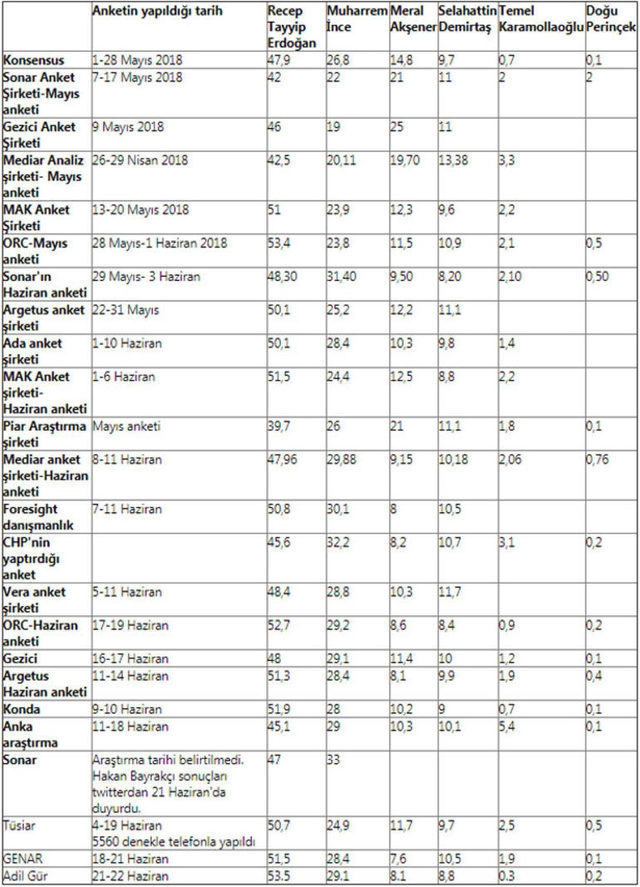 24 Haziran cumhurbaşkanlığı ve genel seçimleri sonuçlarına yönelik olarak Mayıs ayından bu yana, Türkiye'deki tüm anket şirketleri ulaştıkları sonuçları yayımladı.