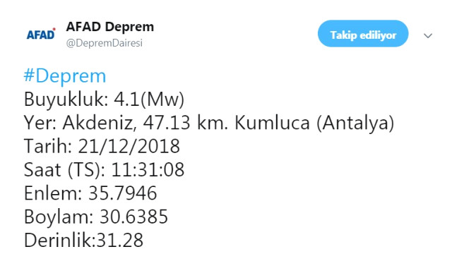 AFAD’dan edinilen ilk bilgiye göre; Deprem Kumluca ilçesinin açıklarında meydana geldi. Depremin büyüklüğü 4.1 olarak açıklanırken saat 11.31’de gerçekleştiği belirtildi.