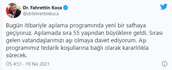 Bugün (19 Nisan 2021) itibariyle aşılama programında yeni bir safhaya geçildiğini duyuran Koca, "Aşılamada sıra 55 yaşından büyüklere geldi" bilgisini verdi. Sırası gelenleri aşı olmaya davet eden Koca, "Aşı programımız tedarik koşullarına bağlı olarak kararlılıkla sürecek" ifadesini kullandı.