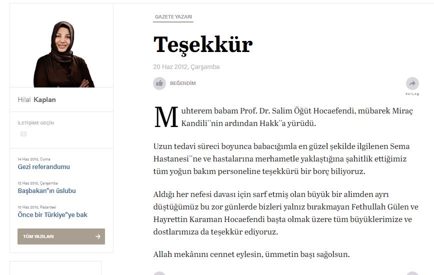 Kaplan o teşekküründe “Muhterem babam Prof. Dr. Salim Öğüt Hocaefendi, mübarek Miraç Kandili''nin ardından Hakk'a yürüdü. Bu zor günlerde bizleri yalnız bırakmayan Fethullah Gülen ve Hayrettin Karaman Hocaefendi başta olmak üzere tüm büyüklerimize ve dostlarımıza da teşekkür ediyoruz” ifadelerini kullanıyor.