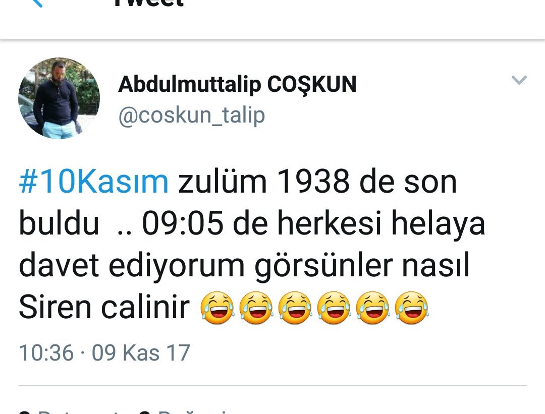 Profilinde Türkiye Gençlik Vakfı (TÜGVA) Beylikdüzü Kurucu Yönetim Kurulu Üyesi olarak kendini tanıtan Abdulmuttalip Coşkun isimli kullanıcı yaptığı paylaşımda, “Zulüm 1938’de son buldu. 09.05’de herkesi helaya davet ediyorum. Görsünler nasıl siren çalınır” ifadelerini kullandı.