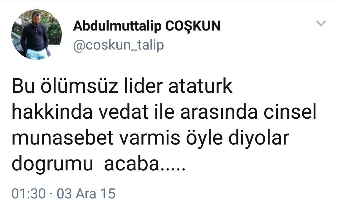 Coşkun isimli kullanıcının 3 Aralık 2015 yılında da Atatürk’e hakaret eden bir tweet attığı öğrenildi. Coşkun’un “Bu ölümsüz lider Atatürk hakkında vedat ile arasında cinsel münasebet varmış öyle diyorlar doğru mu acaba” ifadelerini de paylaştığı ortaya çıktı.