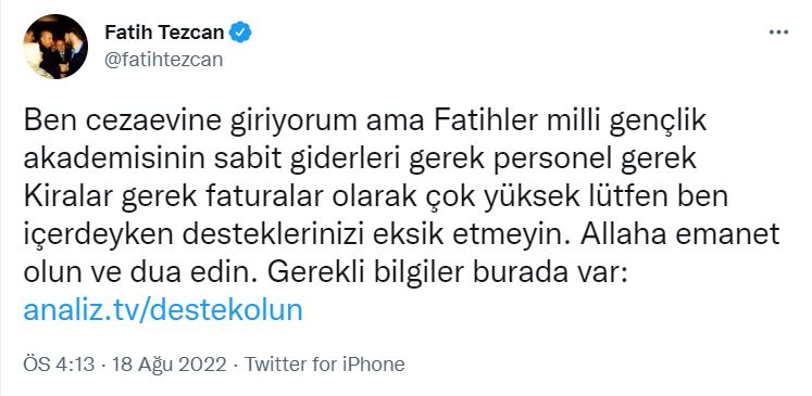Tezcan Twitter’dan yaptığı açıklamada, “Cezaevine giriyorum, Allah’a emanet olun” diyerek hapse gireceğini duyurdu.