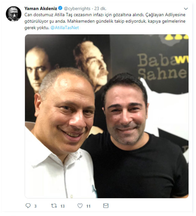 Şarkıcı Atilla Taş'ın gözaltına alındığını sosyal medyadan duyuran akademisyen Yaman Akdeniz, şarkıcının Çağlayan'daki İstanbul Adliyesine götürüldüğünü söyledi. Akdeniz, "Mahkemeden gündelik takip ediyorduk, kapıya gelmelerine gerek yoktu" yorumunda bulundu.