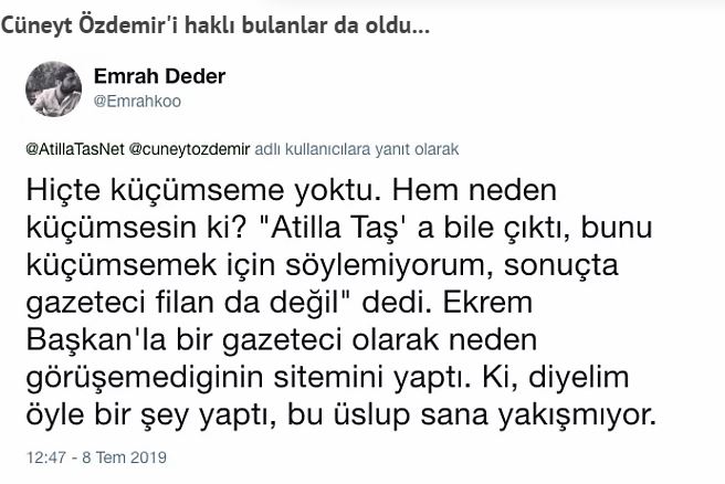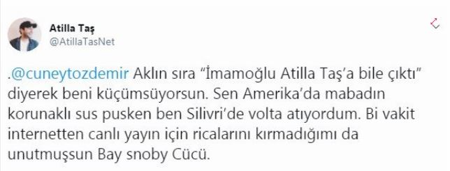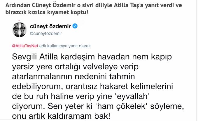 Son dönemlerde sosyal medyayı oldukça aktif kullanıp herkesi ti'ye alan gazeteci Cüneyt Özdemir, bu kez Atilla Taş üzerinden İmamoğlu'na gönderme yaptı.
