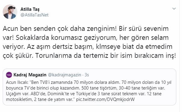 Sosyal medyayı en aktif kullanan ünlülerden biri olan Atilla Taş, sivri açıklamalarıyla dikkat çekiyor. Son olarak Twitter hesabından Acun Ilıca'ya gönderme yapan Taş; Acun ben senden çok daha zenginim!