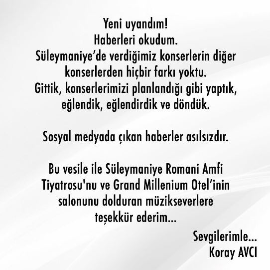 Koray Avcı; Irak'ın Süleymaniye kentinde düzenlediği konserde sözde kürdistan bayrağının indirilmemesi durumunda şarkı söylemeyeceğini belirtti.