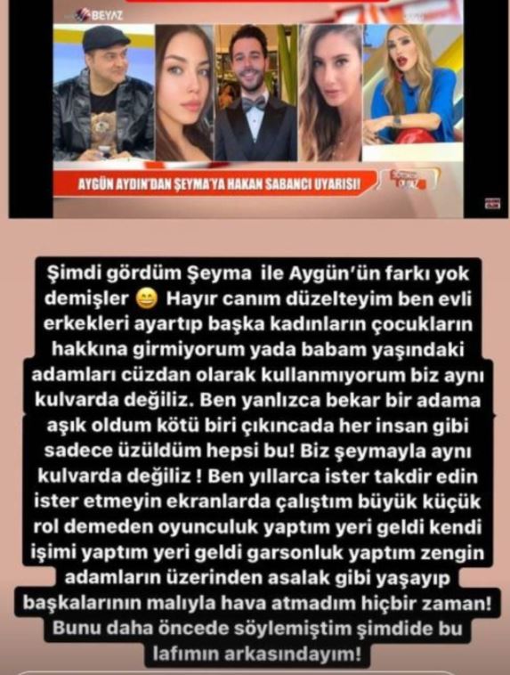 Aydın yaptığı işleri anlatarak "Biz Şeyma'yla aynı kulvarda değiliz. Ben yıllarca ister takdir edin ister etmeyin ekranlarda çalıştım. Zengin adamların üzerinden asalak gibi yaşayıp başkalarının malıyla hava atmadım" dedi.
