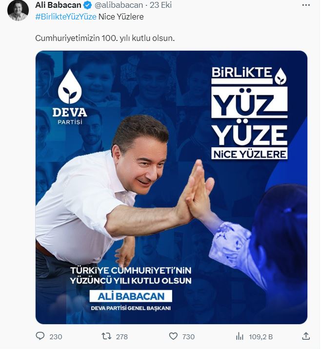 DEVA Partisi lideri Ali Babacan'da Cumhuriyet'imizin 100.yılına özel sosyal medya hesabından bir görsel paylaştı.