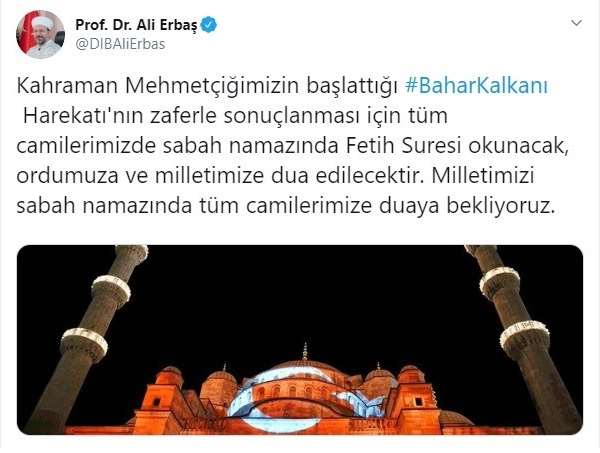 Diyanet İşleri Başkanı Erbaş, Twitter hesabından yaptığı paylaşımda, "Kahraman Mehmetçiğimizin başlattığı #BaharKalkanı Harekatı'nın zaferle sonuçlanması için tüm camilerimizde sabah namazında Fetih Suresi okunacak, ordumuza ve milletimize dua edilecektir. Milletimizi sabah namazında tüm camilerimize duaya bekliyoruz" ifadelerini kullandı.
