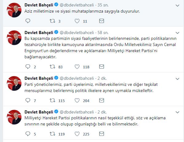 Bahçeli twitter hesabından yaptığı şok açıklamada, Bu kapsamda partimizin siyasi faaliyetlerinin belirlenmesinde, parti politikalarının tezahürüyle birlikte kamuoyuna aktarılmasında Ordu Milletvekilimiz Sayın Cemal Enginyurt’un değerlendirme ve açıklamaları Milliyetçi Hareket Partisi’ni bağlamayacaktır” dedi.