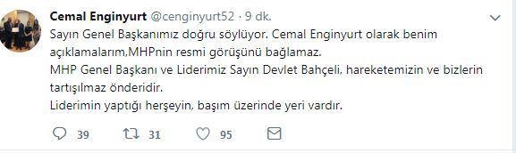 MHP Lideri Bahçeli'nin flaş açıklamasının ardından Enginyurt twitter hesabından yaptığı açıklamada; "Sayın Genel Başkanımız doğru söylüyor. Cemal Enginyurt olarak benim açıklamalarım, MHPnin resmi görüşünü bağlamaz. MHP Genel Başkanı ve Liderimiz Sayın Devlet Bahçeli, hareketimizin ve bizlerin tartışılmaz önderidir. Liderimin yaptığı herşeyin, başım üzerinde yeri vardır" dedi.