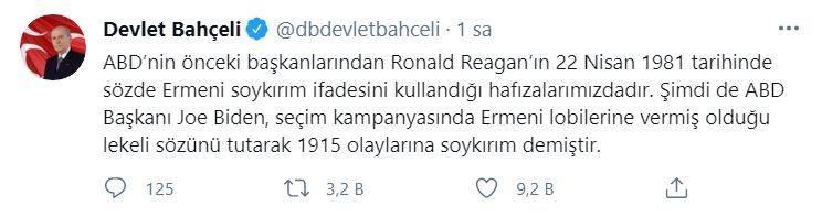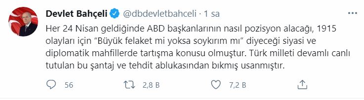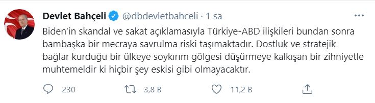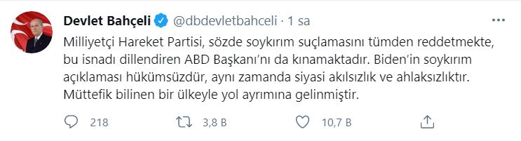 Bahçeli, "Milliyetçi Hareket Partisi, sözde soykırım suçlamasını tümden reddetmekte, bu isnadı dillendiren ABD Başkanı’nı da kınamaktadır. Biden’in soykırım açıklaması hükümsüzdür, aynı zamanda siyasi akılsızlık ve ahlaksızlıktır. Müttefik bilinen bir ülkeyle yol ayrımına gelinmiştir" sözleriyle tepkisini dile getirdi.