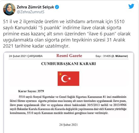 Aile, Çalışma ve Sosyal Hizmetler Bakanı Zehra Zümrüt Selçuk, "51 il ve 2 ilçemizde üretim ve istihdamı artırmak için 5510 sayılı Kanundaki “5 puanlık” indirime ilave olarak sigorta primine esas kazanç alt sınırı üzerinden “ilave 6 puan” olarak uygulanmakta olan sigorta prim teşvikinin süresi 31 Aralık 2021 tarihine kadar uzatılmıştır." açıklamasında bulundu.