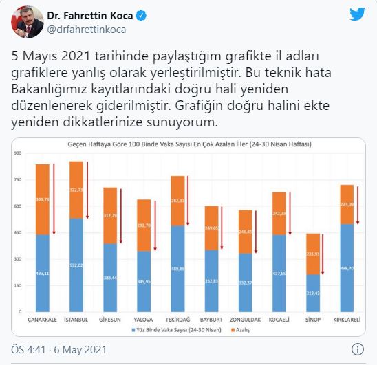 "5 Mayıs 2021 tarihinde paylaştığım grafikte il adları grafiklere yanlış olarak yerleştirilmiştir" diyen Koca, devamında "Bu teknik hata Bakanlığımız kayıtlarındaki doğru hali yeniden düzenlenerek giderilmiştir. Grafiğin doğru halini ekte yeniden dikkatlerinize sunuyorum" ifadesini kullandı.