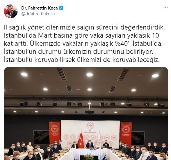 Bakan Koca, toplantıya ilişkin Twitter hesabından yaptığı paylaşımda, "İstanbul'da mart başına göre vaka sayıları yaklaşık 10 kat arttı. Ülkemizde vakaların yaklaşık yüzde 40'ı İstanbul'da. İstanbul'un durumu ülkemizin durumunu belirliyor. İstanbul'u koruyabilirsek ülkemizi de koruyabileceğiz" ifadelerini kullanırken,