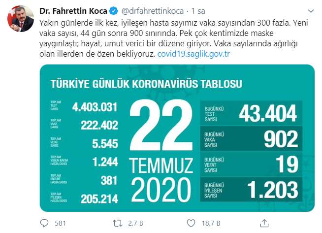 Sağlık Bakanlığının internet sitesinde yer alan ve Bakan Fahrettin Koca'nın da Twitter'dan paylaştığı 22 Temmuz 2020 'Türkiye Günlük Koronavirüs Tablosu'nun güncel verilerine göre; 43 bin 404 yeni test yapıldı, 902 kişiye Kovid-19 tanısı konuldu. Son 24 saatte 19 hasta vefat etti, 1203 kişi iyileşti.