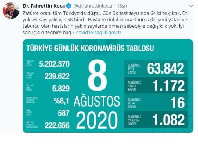 Sağlık Bakanı Fahrettin Koca 8 Ağustos 2020 Türkiye'nin güncel koronavirüs verileri açıkladı.