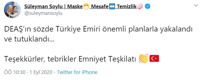 Önemli gelişmeyi Twitter'dan duyuran İçişleri Bakanı Süleyman Soylu, DEAŞ'ın sözde Türkiye emirinin yakalandığını duyurdu ve Emniyet Teşkilatı'na teşekkür etti.