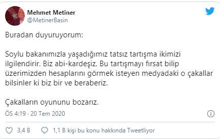 "Buradan duyuruyorum: Soylu bakanımızla yaşadığımız tatsız tartışma ikimizi ilgilendirir. Biz abi-kardeşiz. Bu tartışmayı fırsat bilip üzerimizden hesaplarını görmek isteyen medyadaki o çakallar bilsinler ki biz bir ve beraberiz. Çakalların oyununu bozarız."
